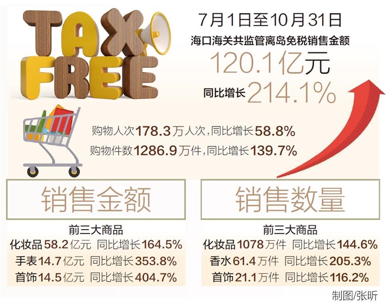 11月10日,??诤jP(guān)披露,統(tǒng)計(jì)數(shù)據(jù)顯示,7月1日至10月31日,海南離島免稅新政實(shí)施4個(gè)月,??诤jP(guān)共監(jiān)管離島免稅銷售金額120.1億元,同比(下同)增長(zhǎng)214.1%;購(gòu)物人次178.3萬(wàn)人次,增長(zhǎng)58.8%;購(gòu)物件數(shù)1286.9萬(wàn)件,增長(zhǎng)139.7%。