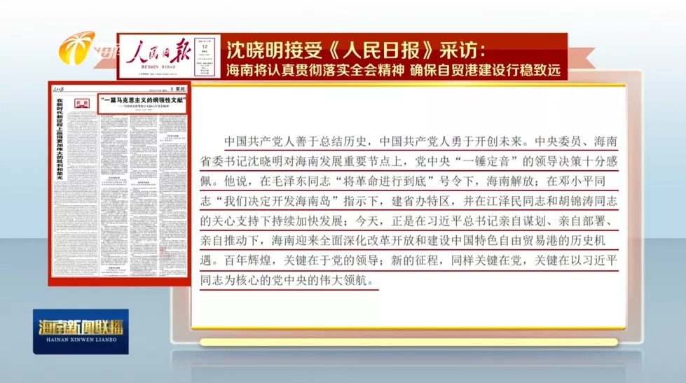 點擊藍字 關注我們 近日,中央委員、海南省委書記沈曉明接受人民日報、新華社、中央廣播電視總臺采訪,表示海南將認真貫徹落實…