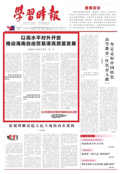 8月23日,學(xué)習(xí)時(shí)報(bào)在頭版刊發(fā)海南省人民政府省長(zhǎng)馮飛署名文章《以高水平對(duì)外開(kāi)放推動(dòng)海南自由貿(mào)易港高質(zhì)量發(fā)展》。下附全文↓…